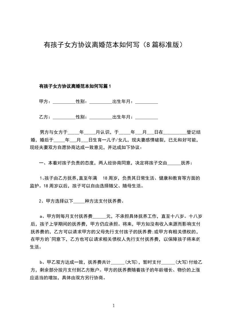 有孩子女方协议离婚范本如何写篇8