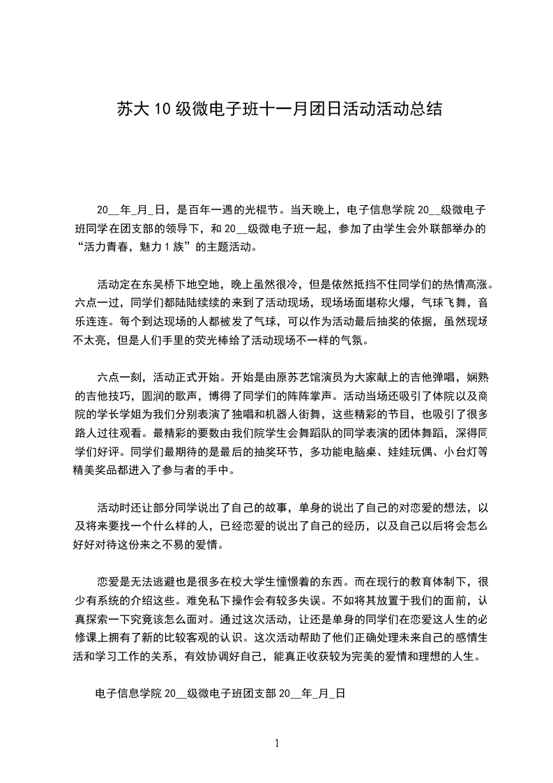 20__年_月_日,是百年一遇的光棍节。当天晚上,电子信息学院20__级微电子班同学在团支部的领导下,和20__级微电子班一起,参加了由学生会外联部举办的“活力青春,魅力1族”的主题活动。