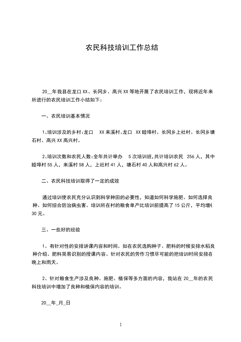 20__年我县在龙口XX、长冈乡、高兴XX等地开展了农民培训工作,现将近年来所进行的农民培训工作小结如下: