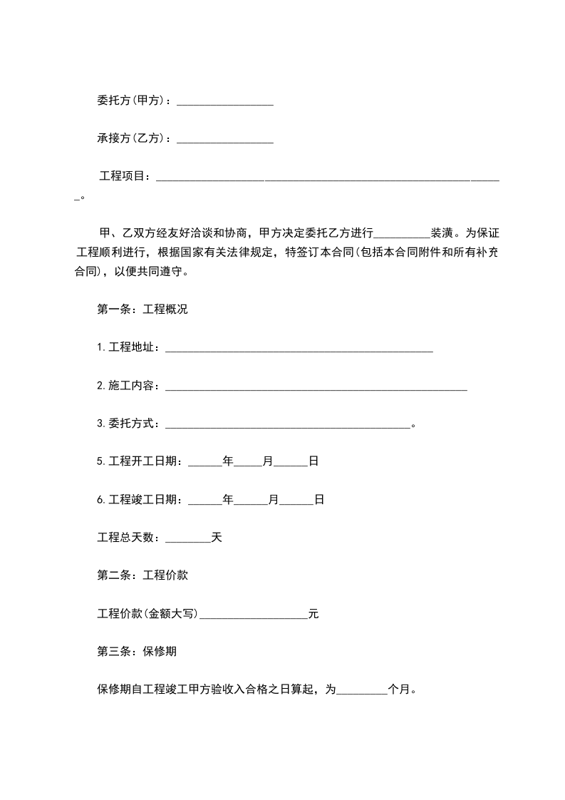 甲、乙双方经友好洽谈和协商,甲方决定委托乙方进行__________装潢。为保证工程顺利进行,根据国家有关法律规定,特签订本合同(包括本合同附件和所有补充合同),以便共同遵守。
