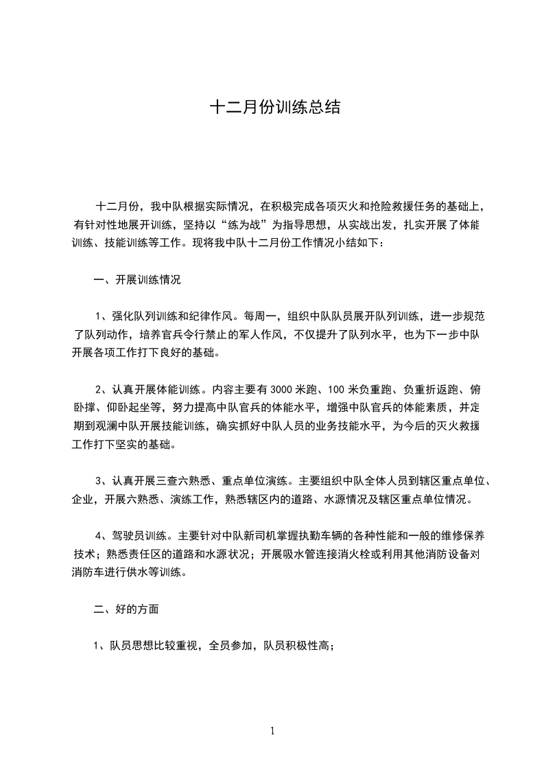 十二月份,我中队根据实际情况,在积极完成各项灭火和抢险救援任务的基础上,有针对性地展开训练,坚持以“练为战”为指导思想,从实战出发,扎实开展了体能训练、技能训练等工作。现将我中队十二月份工作情况小结如下: