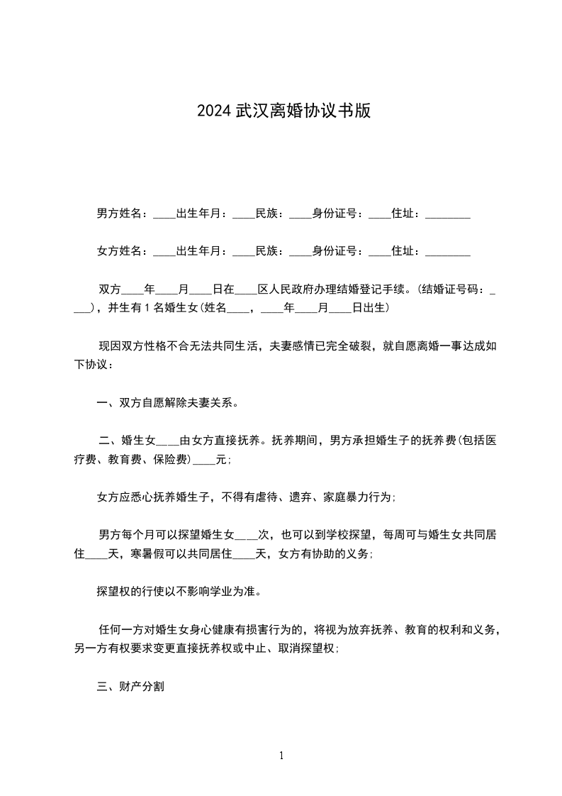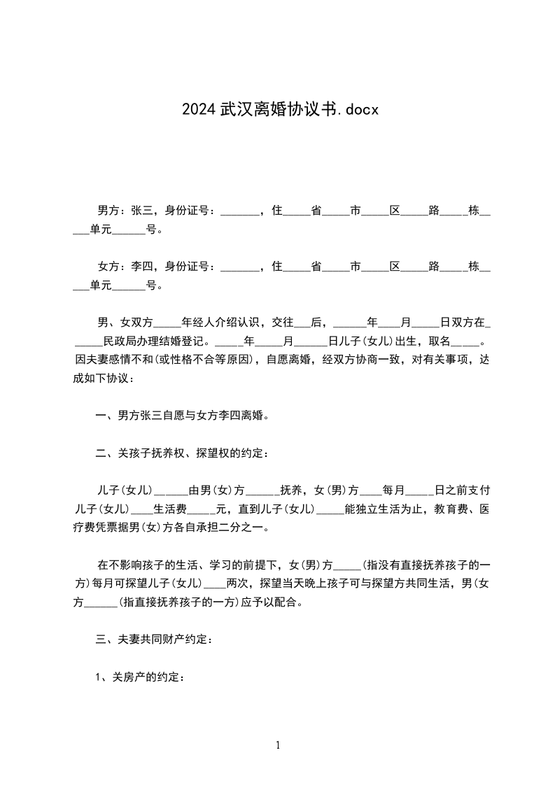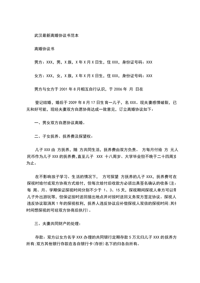 武汉最新离婚协议书范本