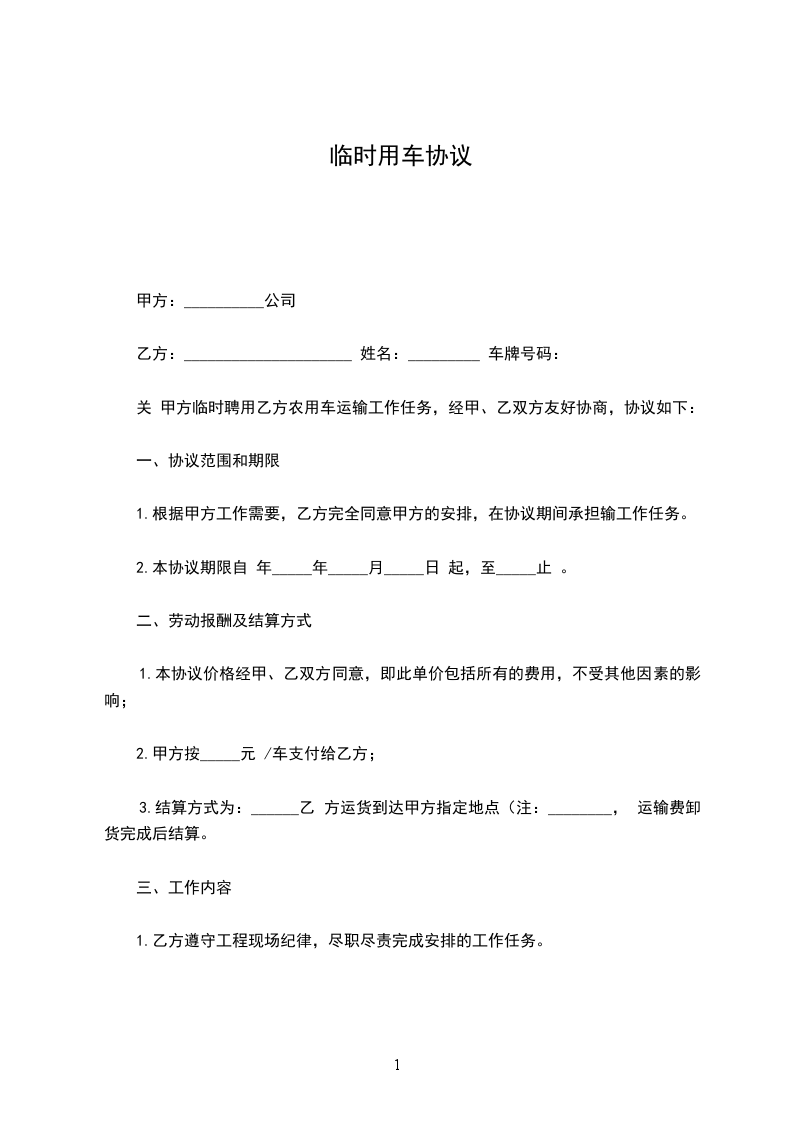 关 甲方临时聘用乙方农用车运输工作任务,经甲、乙双方友好协商,协议如下: