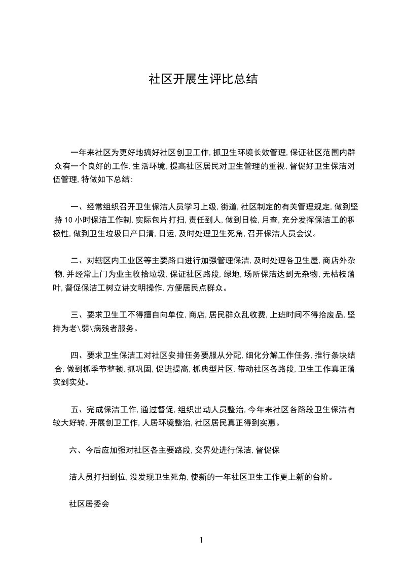 一年来社区为更好地搞好社区创卫工作,抓卫生环境长效管理,保证社区范围内群众有一个良好的工作,生活环境,提高社区居民对卫生管理的重视,督促好卫生保洁对伍管理,特做如下总结: