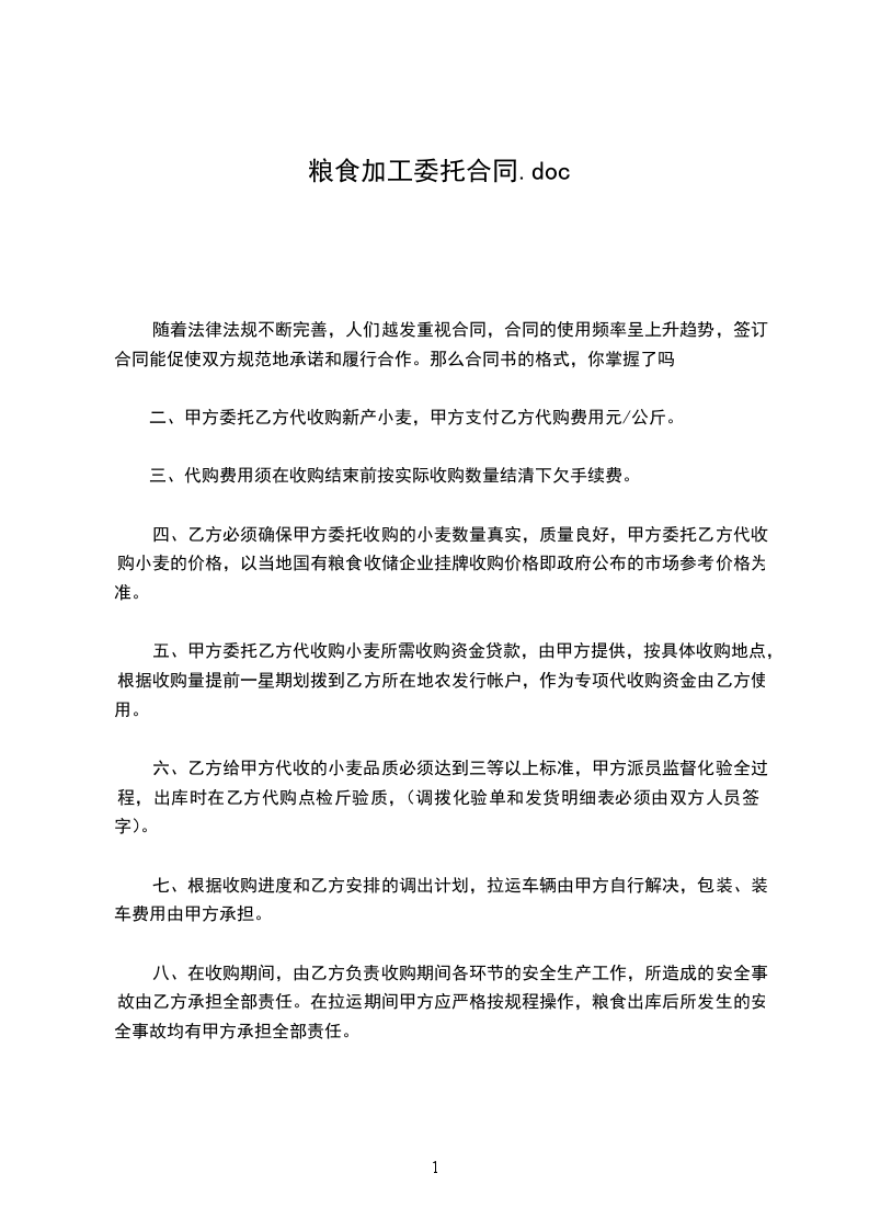 八、在收购期间,由乙方负责收购期间各环节的安全生产工作,所造成的安全事故由乙方承担全部责任。在拉运期间甲方应严格按规程操作,粮食出库后所发生的安全事故均有甲方承担全部责任。