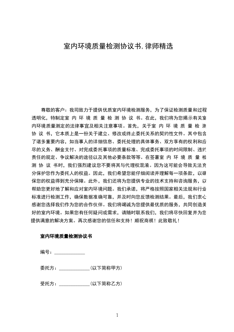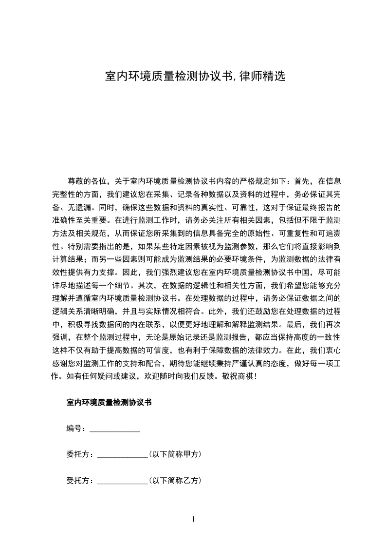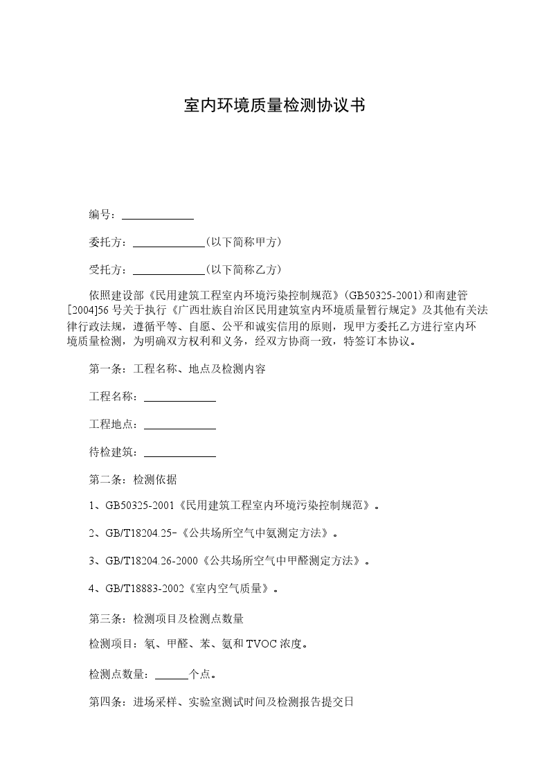 依照建设部《民用建筑工程室内环境污染控制规范》(GB50325-2001)和南建管[2004]56号关于执行《广西壮族自治区民用建筑室内环境质量暂行规定》及其他有关法律行政法规,遵循平等、自愿、公平和诚实信用的原则,现甲方委托乙方进行室内环境质量检测,为明确双方权利和义务,经双方协商一致,特签订本协议。