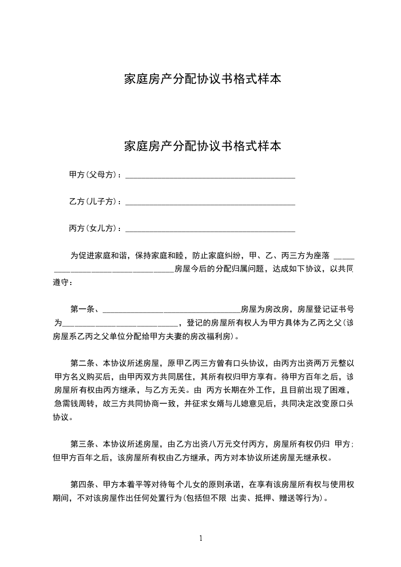 为促进家庭和谐,保持家庭和睦,防止家庭纠纷,甲、乙、丙三方为座落 __________________________________房屋今后的分配归属问题,达成如下协议,以共同遵守: