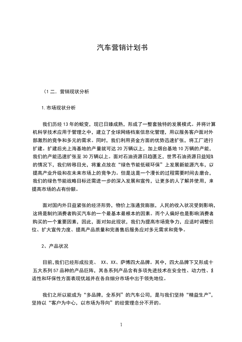 20__年我们公司汽车销售量率先突破100万,使其成为汽车工业史上第一个产销跃上“百万辆”的传统乘用车公司。可以看出我们品牌规划及营销策略具有很大的优越性。因此计划实施多品牌产品战略,包括了引进豪华型的拉克和经济型的佛兰品牌,以进入其他主要的细分市场。在企业目标产品的定位和组合的基础上进行战略性的品牌规划,并通过有效市场营销推广和售后服务的追踪反馈,企业才能全方位的提高综合实力与塑造企业品牌。在品牌塑造营销推广,产品服务及市场信息反馈等方面成功运作,为本公司其他品牌市场的开拓,提供成功的模式。别克车系覆盖了经济型、中档商务和高档用户市场,计划引进的别克君威车型能够弥补汽车20万元附近车型的空白,为此能够在未来占领市场,使其前景越来越好!