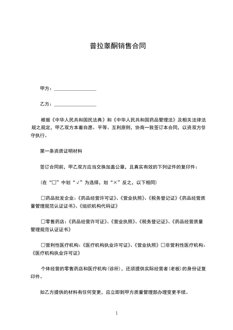 根据《中华人民共和国民法典》和《中华人民共和国药品管理法》及相关法律法规之规定,甲乙双方本着自愿、平等、互利原则,协商一致签订本合同,以资双方信守执行。