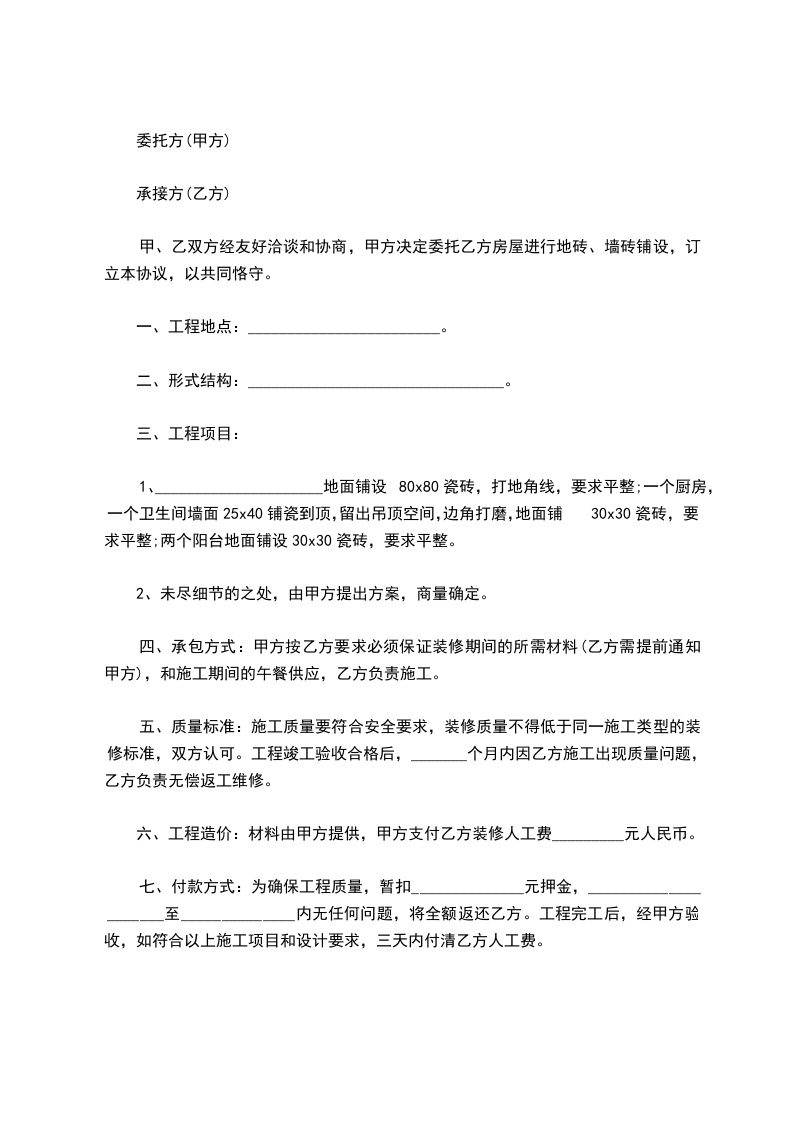 甲、乙双方经友好洽谈和协商,甲方决定委托乙方房屋进行地砖、墙砖铺设,订立本协议,以共同恪守。