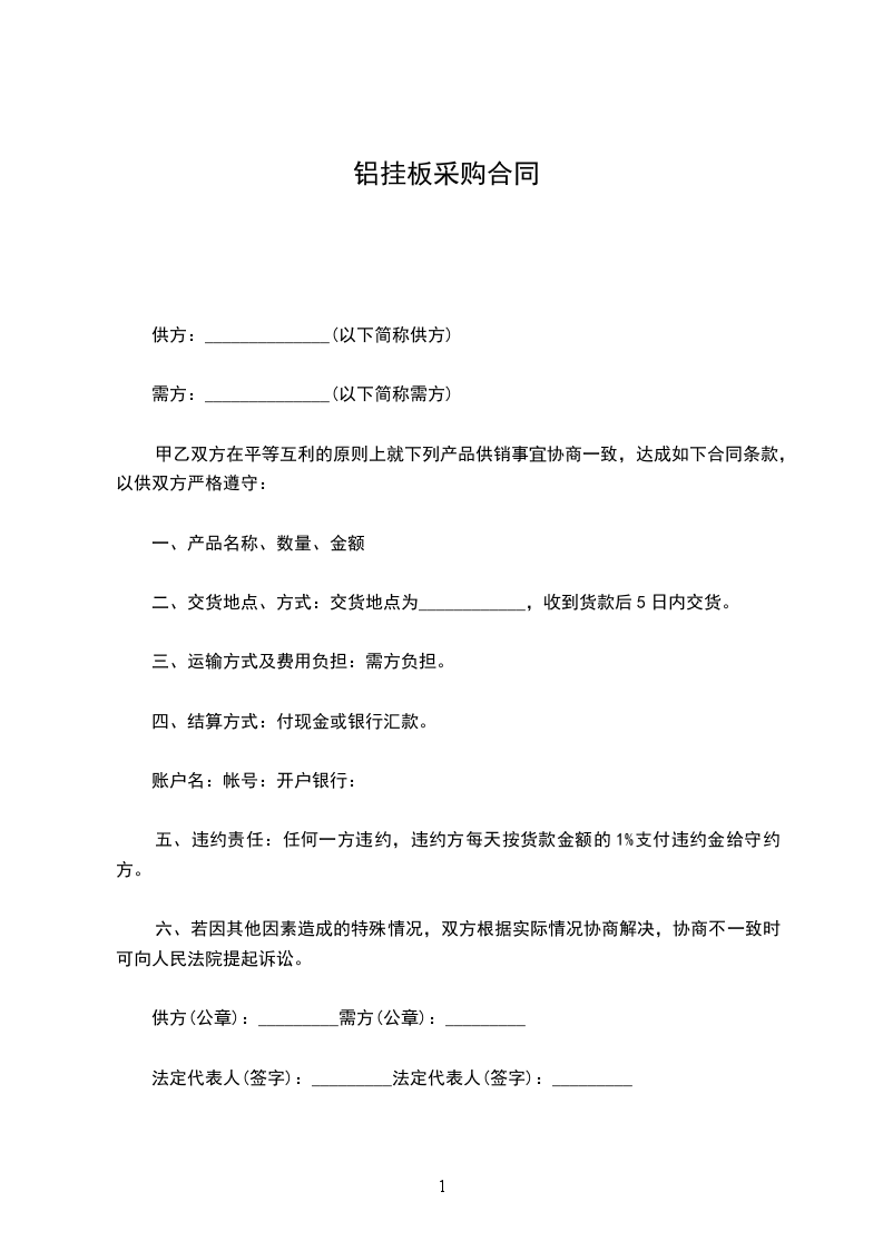 五、违约责任:任何一方违约,违约方每天按货款金额的1%支付违约金给守约方。