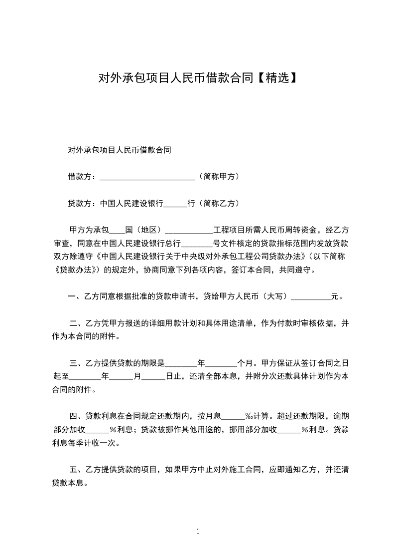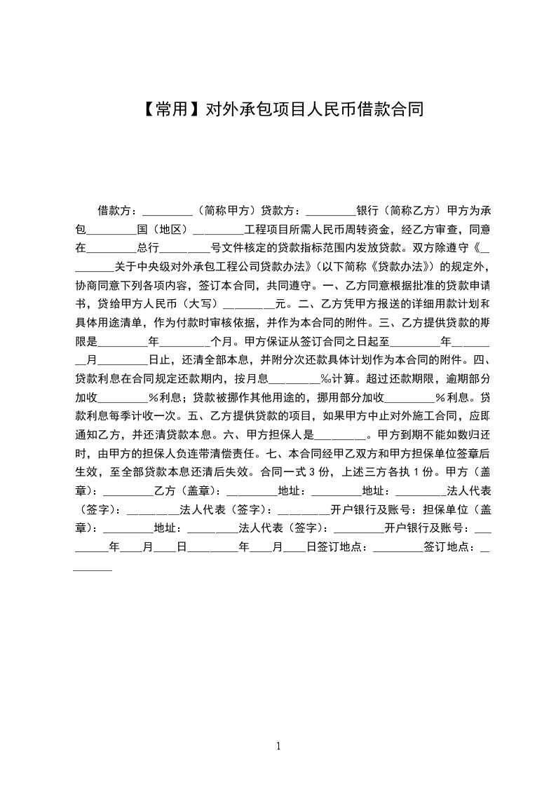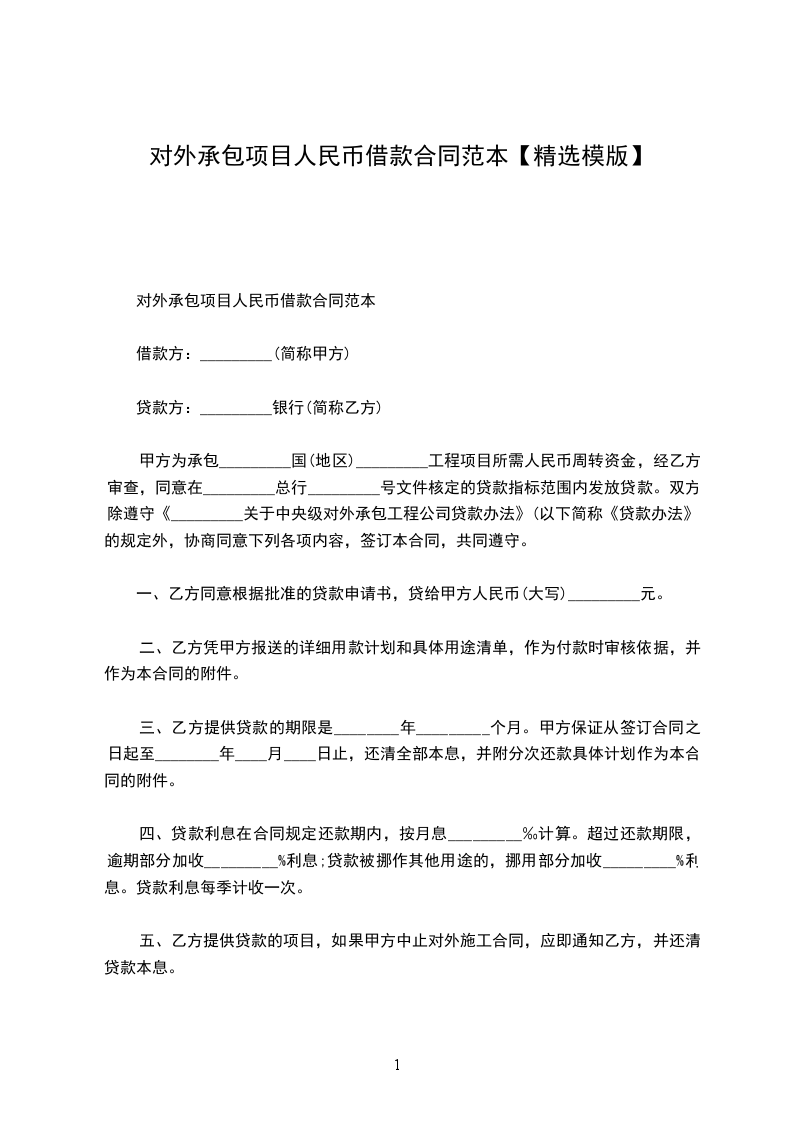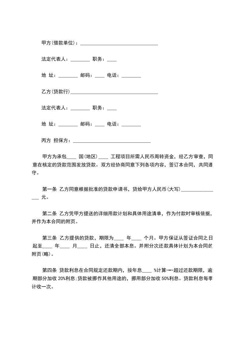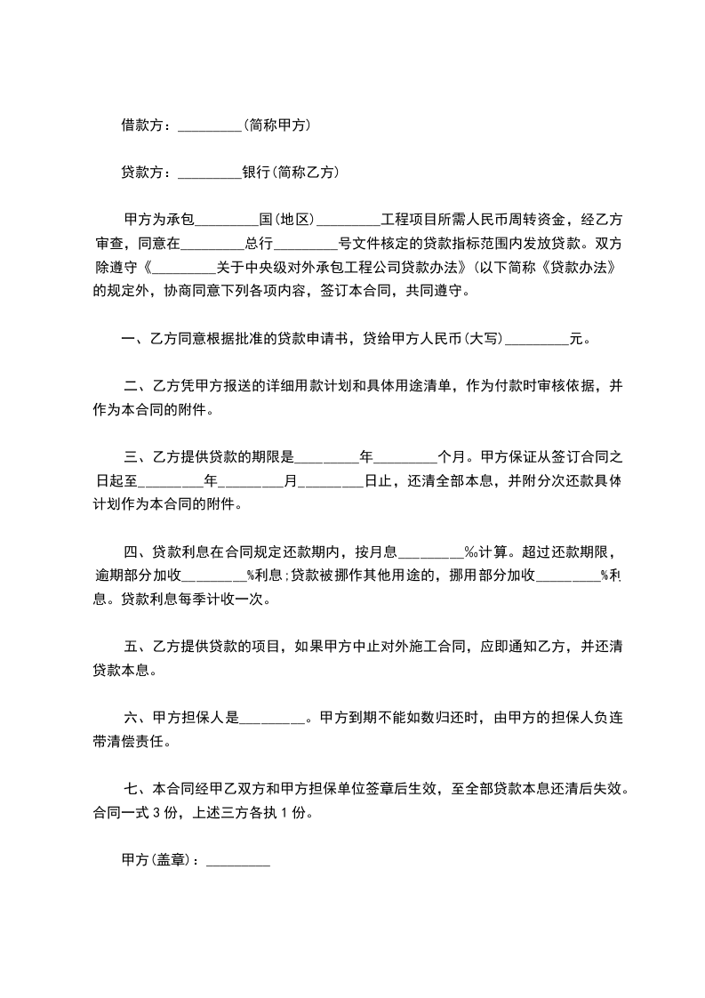 甲方为承包_________国(地区)_________工程项目所需人民币周转资金,经乙方审查,同意在_________总行_________号文件核定的贷款指标范围内发放贷款。双方除遵守《_________关于中央级对外承包工程公司贷款办法》(以下简称《贷款办法》)的规定外,协商同意下列各项内容,签订本合同,共同遵守。