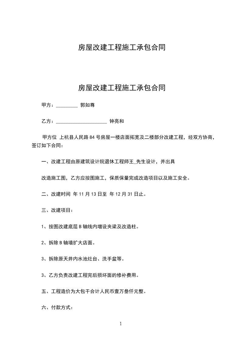 甲方位 上杭县人民路84号房屋一楼店面拓宽及二楼部分改建工程,经双方协商,签订如下合同:
