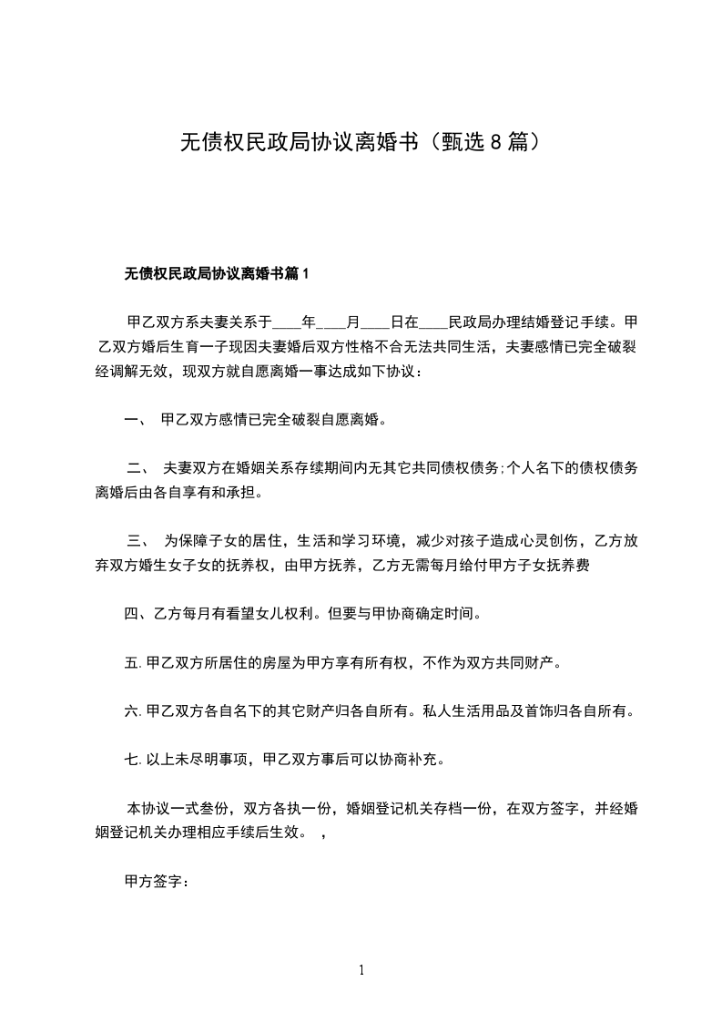 八、本协议一式三份,男、女双方各执一份,婚姻登记机关存档一份,自婚姻登记机颁发《离婚证》之日起生效。九、如本协议生效后在执行中发生争议的,双方应协商解决,协商不成,任何一方均可向相关人民法院起诉。