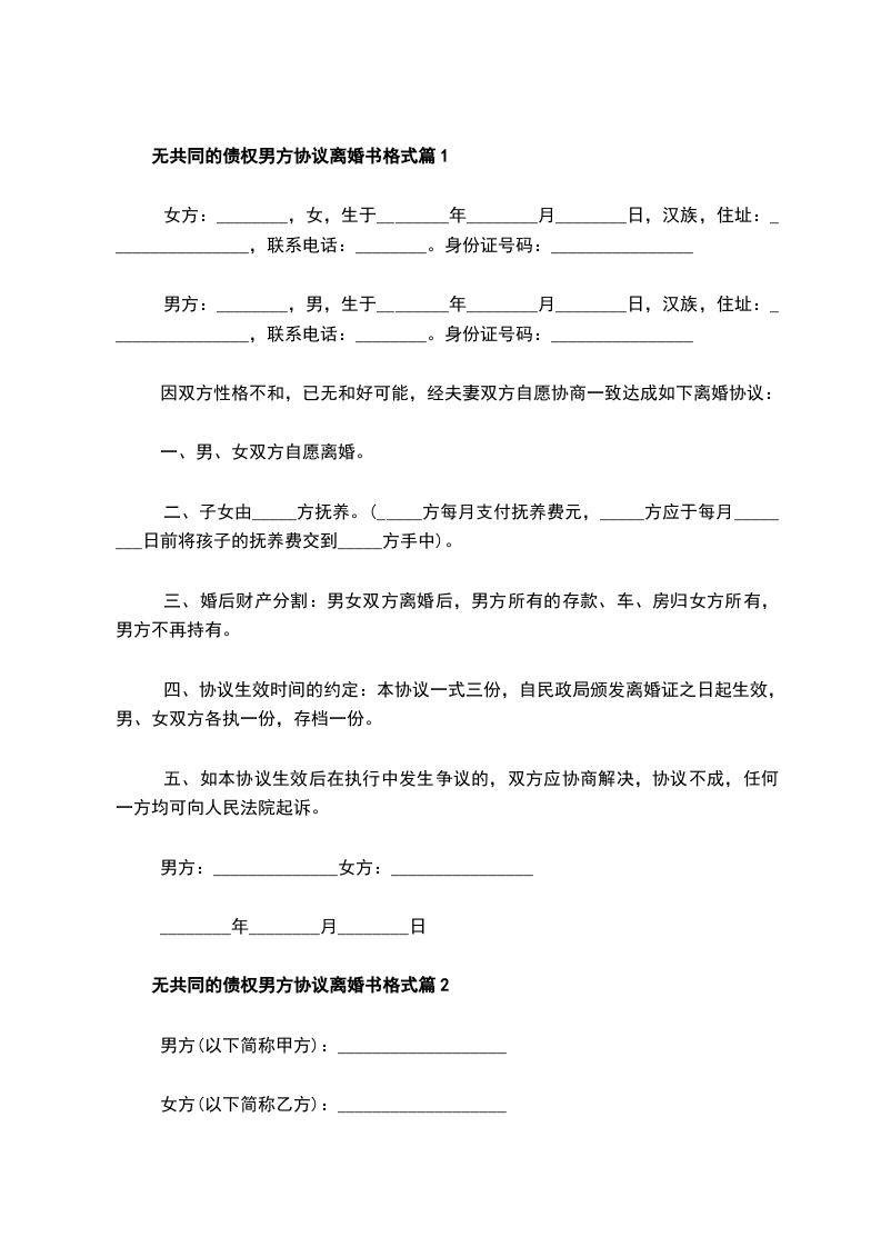 无共同债权债务男方离婚协议书格式篇10
