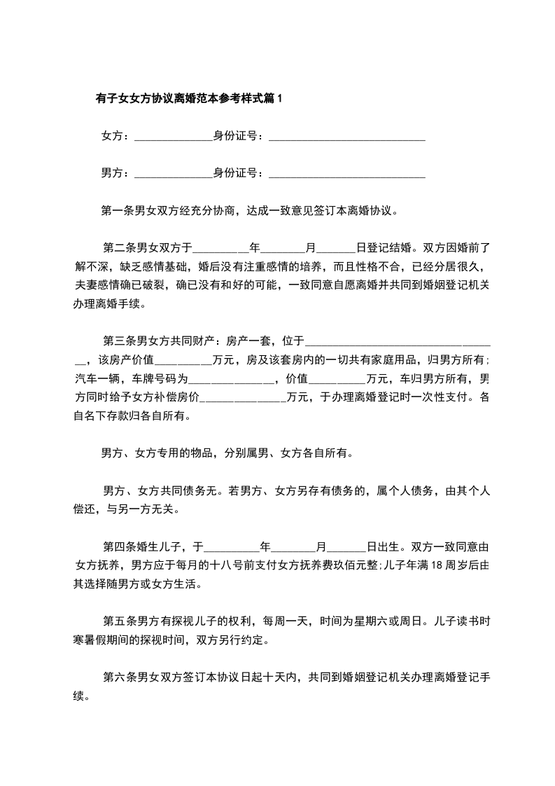 有子女女方协议离婚范本参考样式篇1