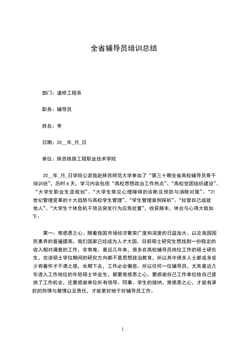20__年_月_日学院公派我赴陕西师范大学参加了“第三十期全省高校辅导员骨干培训班”,历时6天,学习内容包括“高校思想政治工作热点”、“高校党团组织建设”、“大学生职业生涯规划”、“大学生常见心理障碍的诊断及预防与消除对策”、“21世纪管理变革的十大趋势与高校学生管理”、“学生管理案例探析”、“经营自己成就他人”、“大学生个体危机干预及突发行为应急处置”,收获颇丰,体会与心得大致如下: