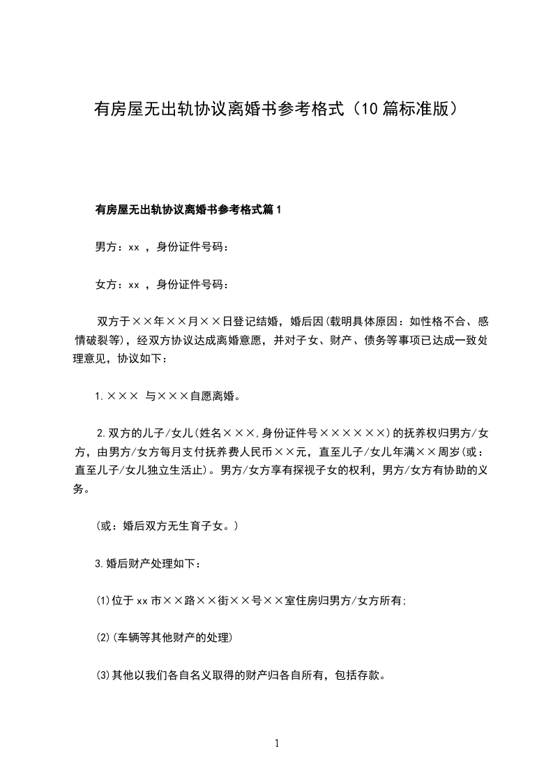 有房屋无出轨协议离婚书参考格式篇10