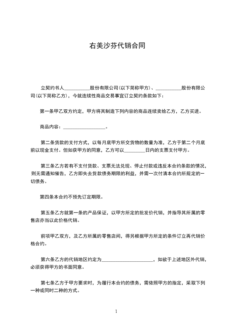 第六条乙方的代销地区约定为______________________,如欲于上述地区外代销,必须获得甲方的书面同意。