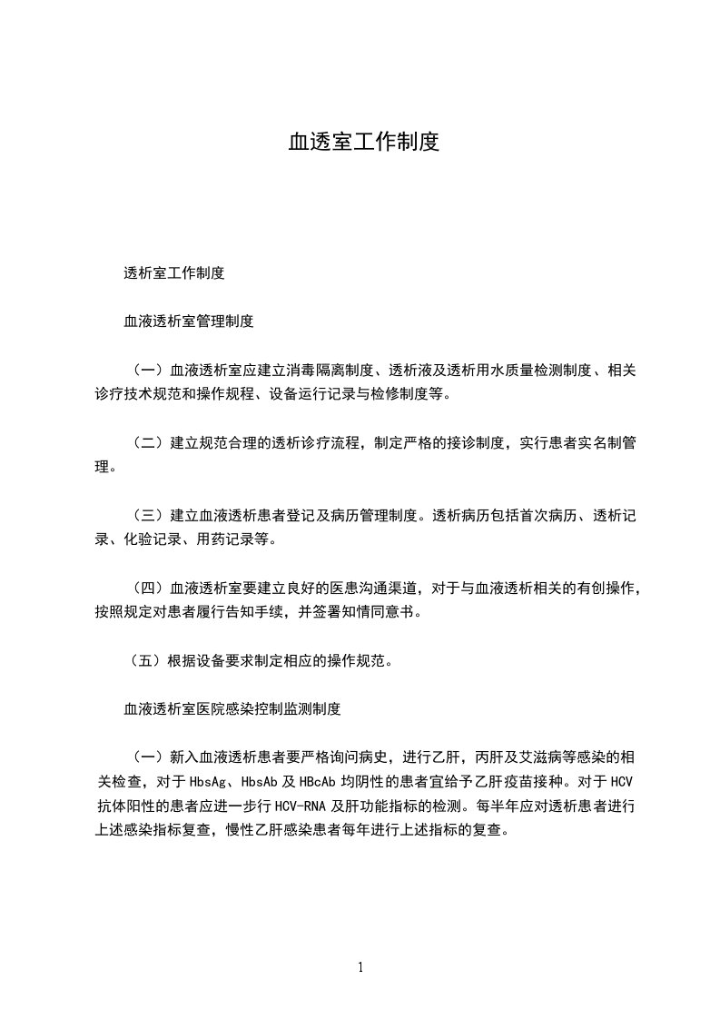 (一)血液透析室应建立消毒隔离制度、透析液及透析用水质量检测制度、相关诊疗技术规范和操作规程、设备运行记录与检修制度等。