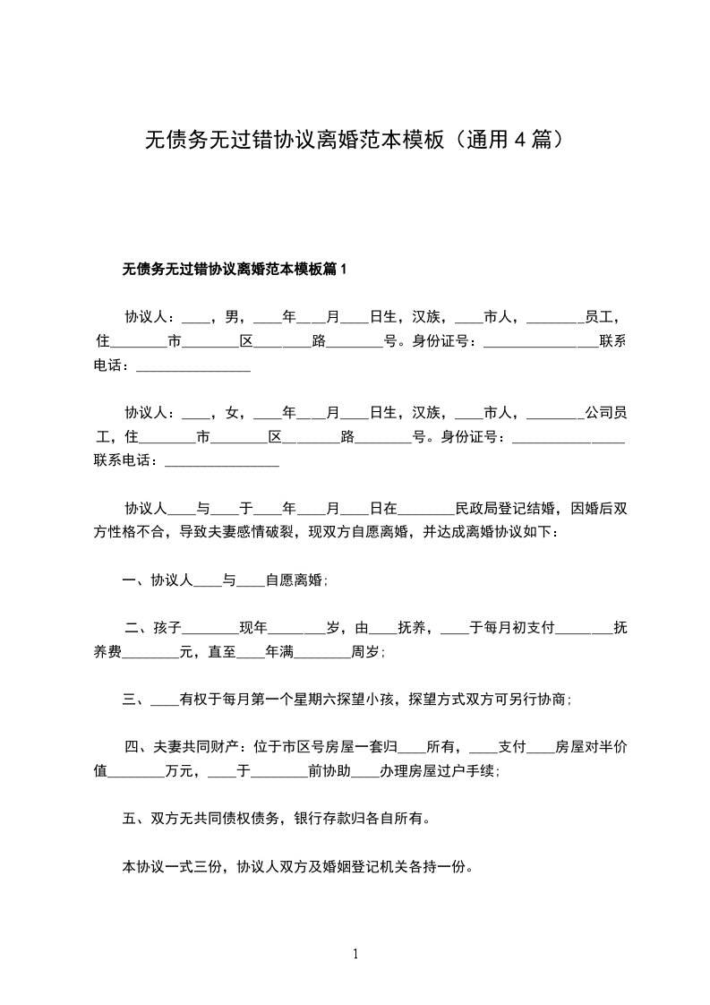 无债务无过错协议离婚范本模板篇1
