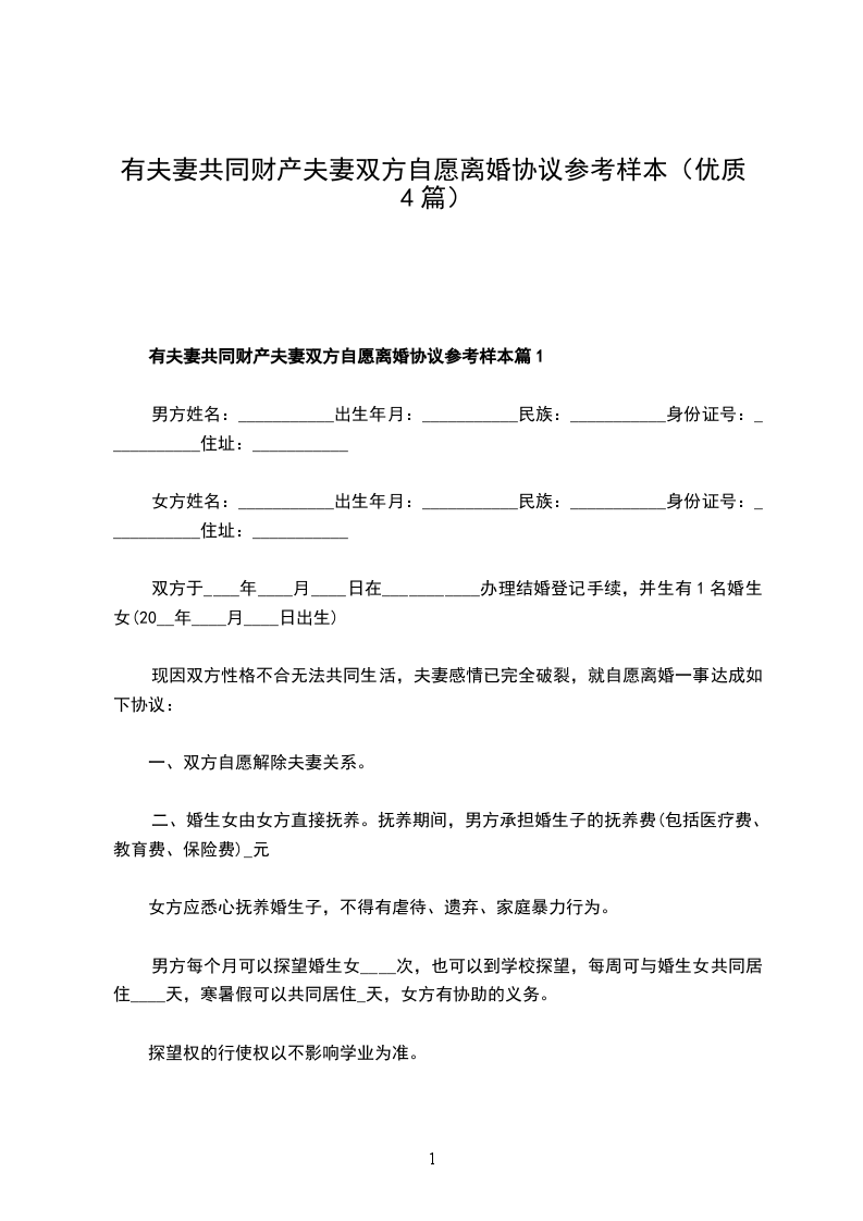 全新夫妻双方自愿离婚协议参考样例篇1