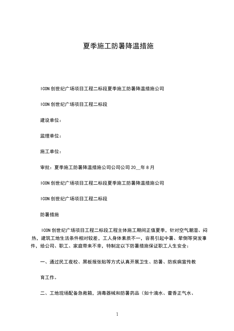 ICON创世纪广场项目工程二标段工程主体施工期间正值夏季,针对空气潮湿、闷热,建筑工地生活条件相对较差,工人身体素质不一,容易引起中暑、晕倒等突发事件,给公司、职工、家庭带来不幸,特制定以下防暑措施保证职工人生安全: