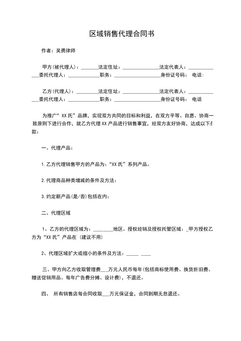 1、乙方的代理区域为:________地区。授权经销及授权托管区域:_甲方授权乙方为“XX氏”产品在 (建议不用)