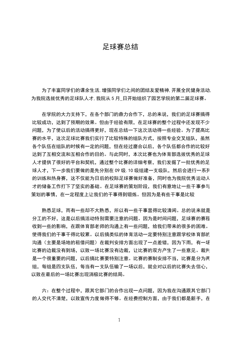 熟悉足球,而有一些却不大熟悉,所以有一些干事显得比较清闲。总的说来就是分工的不好,这是以后搞活动特别需要注意的问题。因为是时间问题,足球赛的赛程收到一些的影响,在跟体育部老师的沟通上有一些问题,给我们带来的很多的困难。使得我们的干事干得比较累。以后搞类似的体育活动一定要特别注意跟学校体育部的沟通(主要是场地的租借问题)在裁判安排方面出现了一点差错,因为下雨,有一场比赛的边裁没有到场,以致一场比赛没有边裁,让比赛的双方产生了一些意见。裁判是一个很重要的问题,以后搞比赛要特别注意。比赛的赛制安排不当,比赛是分为两组,每组是四支队伍,每当有一支队伍输了一场以后,就会对以后的比赛失去信心,以致在最后的一场比赛出现消极比赛的结局。