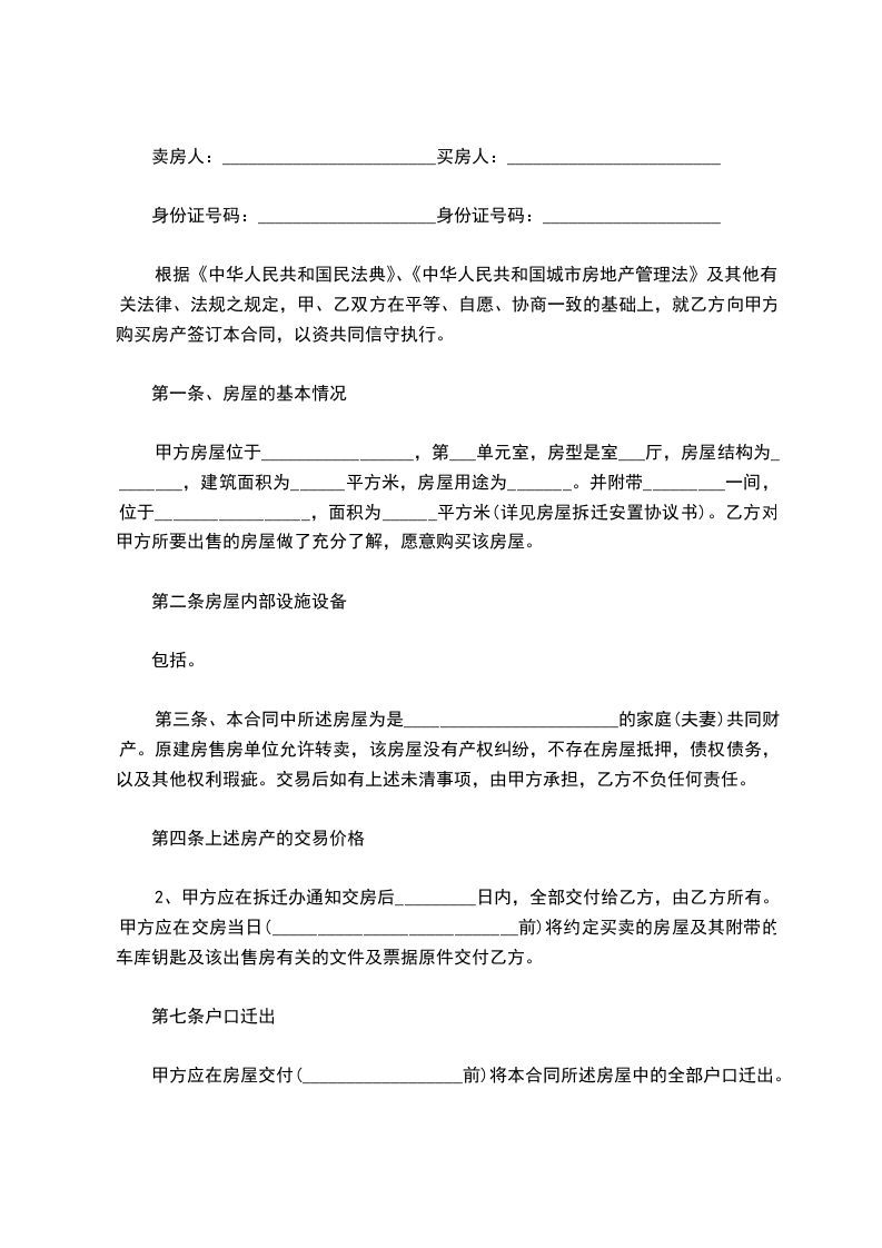 甲方房屋位于_________________,第___单元室,房型是室___厅,房屋结构为________,建筑面积为______平方米,房屋用途为_______。并附带_________一间,位于_________________,面积为______平方米(详见房屋拆迁安置协议书)。乙方对甲方所要出售的房屋做了充分了解,愿意购买该房屋。