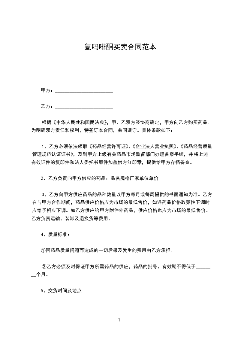根据《中华人民共和国民法典》,甲、乙双方经协商确定,甲方向乙方购买药品。为明确双方责任和权利,特签订本合同,共同遵守。具体条款如下: