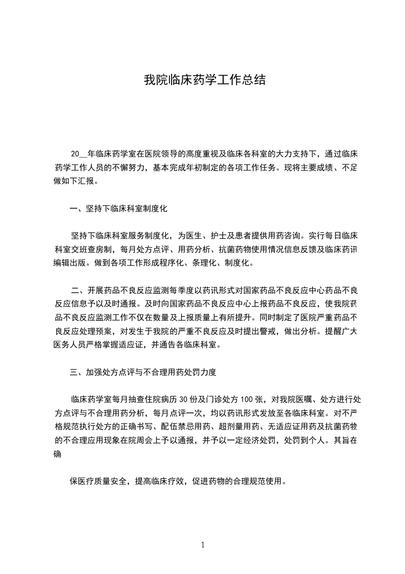 20__年临床药学室在医院领导的高度重视及临床各科室的大力支持下,通过临床药学工作人员的不懈努力,基本完成年初制定的各项工作任务。现将主要成绩、不足做如下汇报。