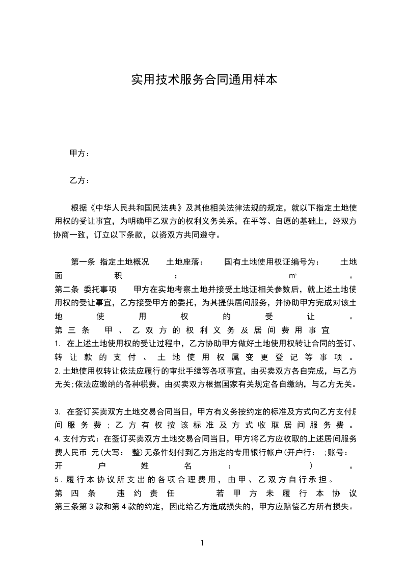 4.支付方式:在签订买卖双方土地交易合同当日,甲方将乙方应收取的上述居间服务费人民币 元(大写: 整)无条件划付到乙方指定的专用银行账户(开户行: ;账号: ;开户姓名: )。
