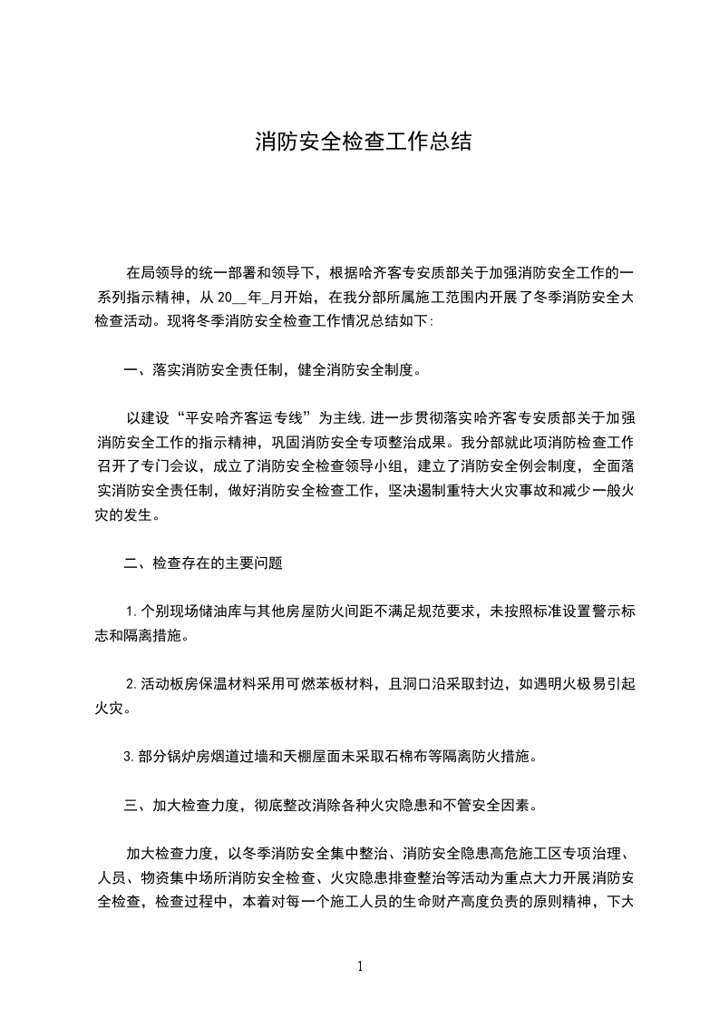 在局领导的统一部署和领导下,根据哈齐客专安质部关于加强消防安全工作的一系列指示精神,从20__年_月开始,在我分部所属施工范围内开展了冬季消防安全大检查活动。现将冬季消防安全检查工作情况总结如下: