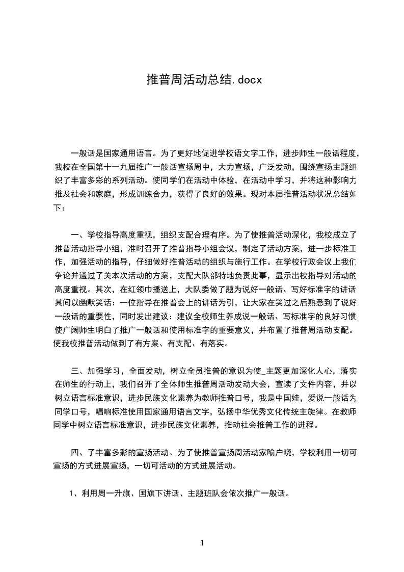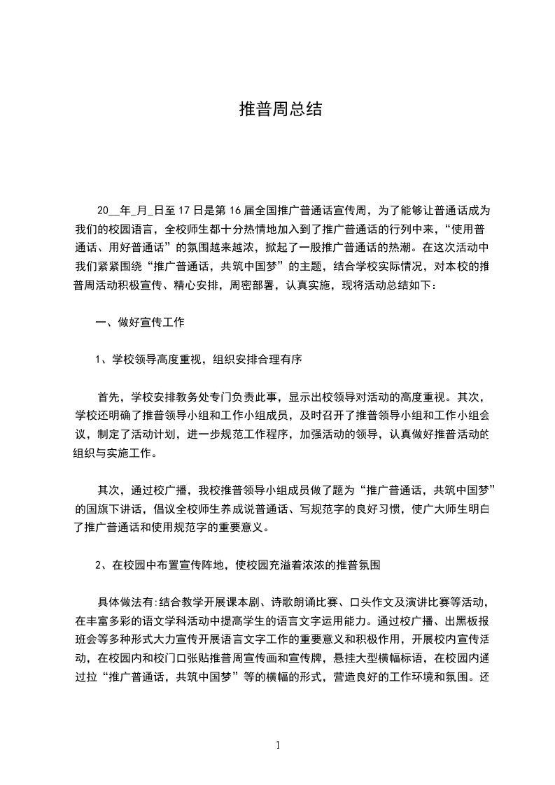 20__年_月_日至17日是第16届全国推广普通话宣传周,为了能够让普通话成为我们的校园语言,全校师生都十分热情地加入到了推广普通话的行列中来,“使用普通话、用好普通话”的氛围越来越浓,掀起了一股推广普通话的热潮。在这次活动中,我们紧紧围绕“推广普通话,共筑中国梦”的主题,结合学校实际情况,对本校的推普周活动积极宣传、精心安排,周密部署,认真实施,现将活动总结如下: