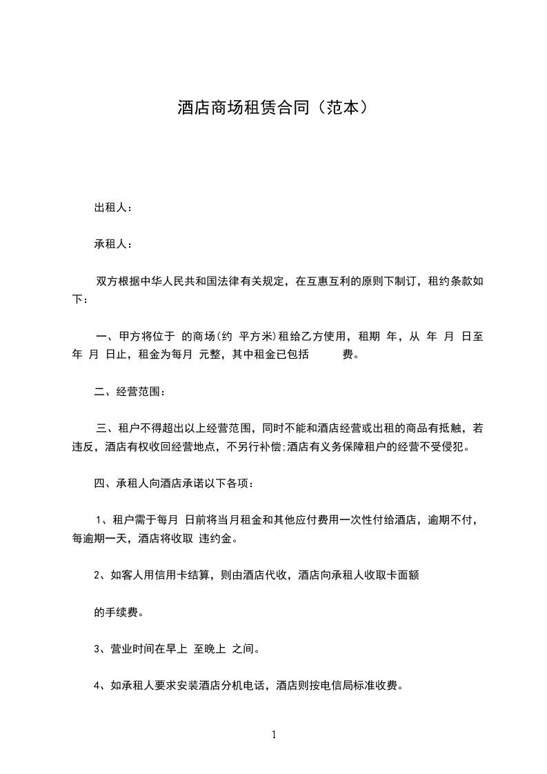 三、租户不得超出以上经营范围,同时不能和酒店经营或出租的商品有抵触,若违反,酒店有权收回经营地点,不另行补偿;酒店有义务保障租户的经营不受侵犯。