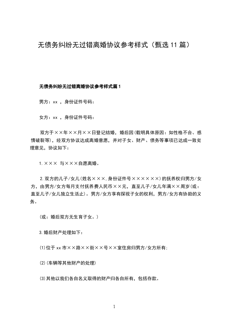 无债务纠纷无过错离婚协议参考样式篇11