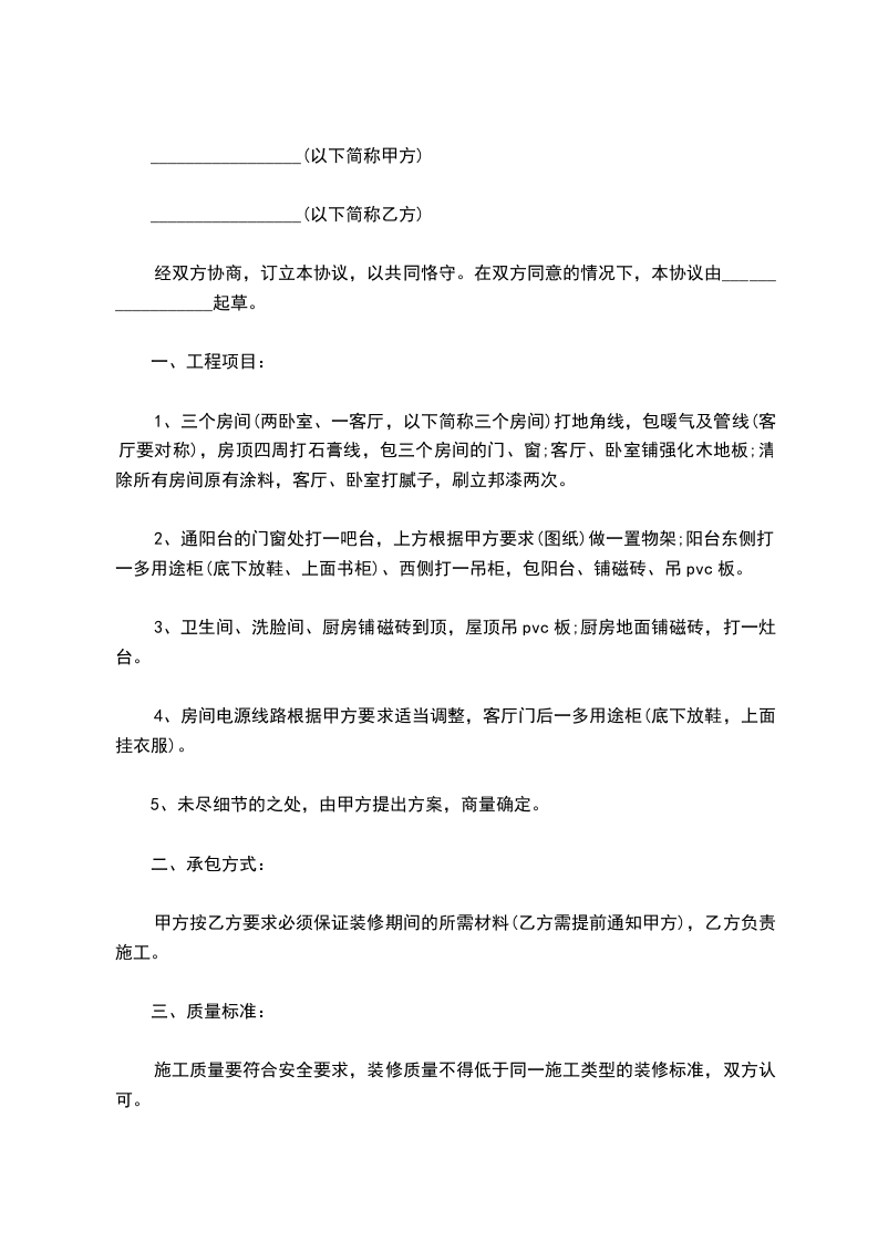 四、承包方式:甲方按乙方要求必须保证装修期间的所需材料(乙方需提前通知甲方),和施工期间的午餐供应,乙方负责施工。