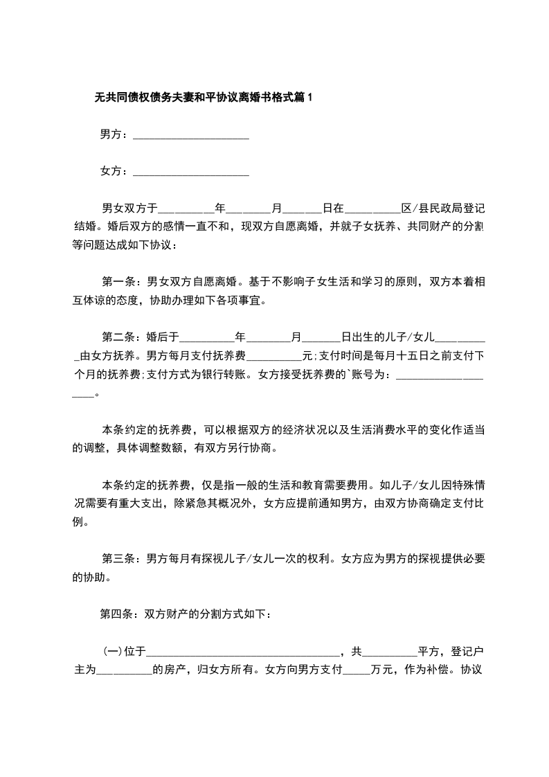 无共同债权债务夫妻离婚协议模板篇1