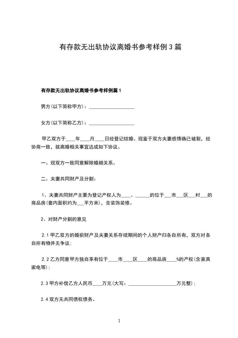 有存款无出轨协议离婚书参考样例篇1