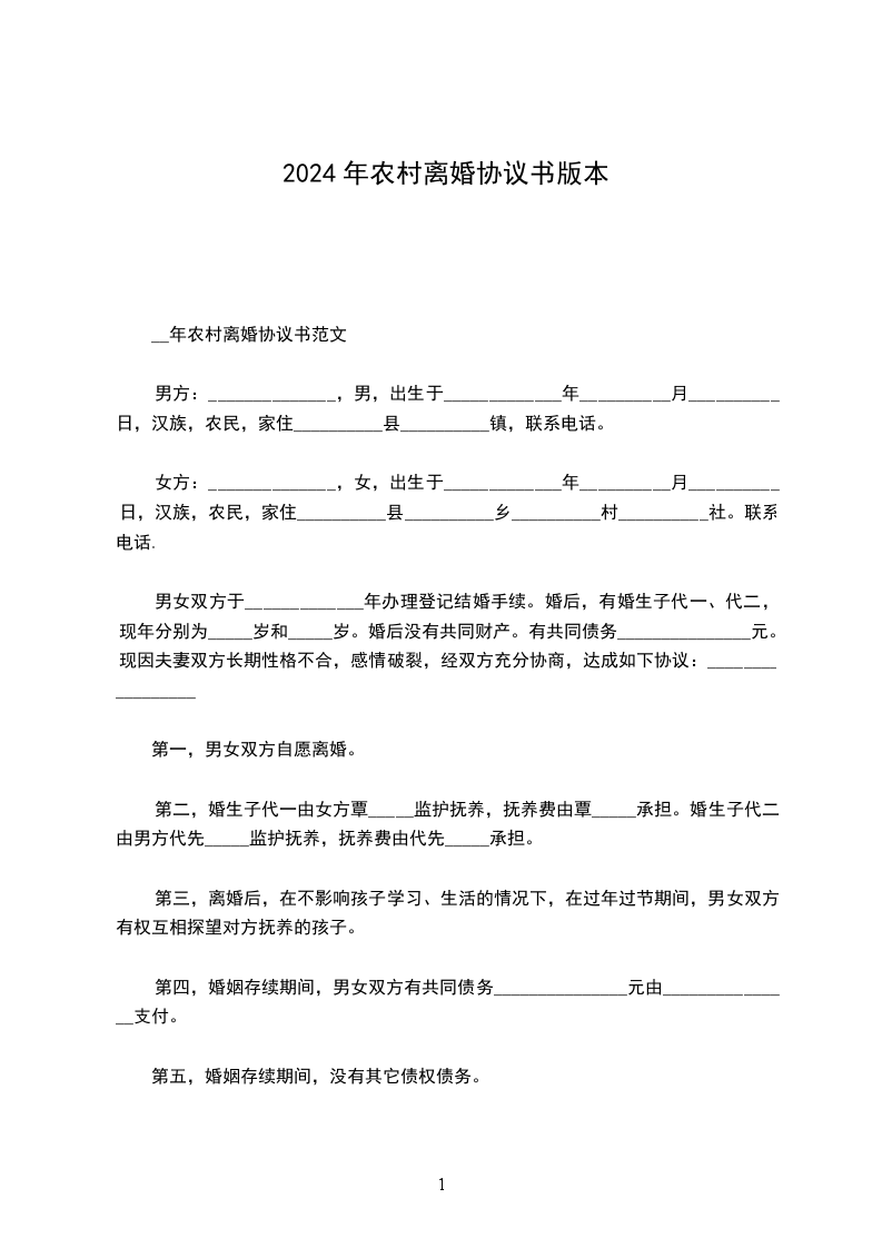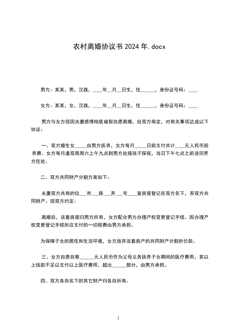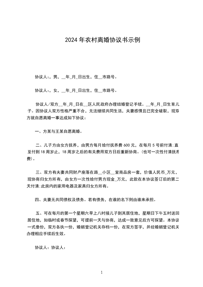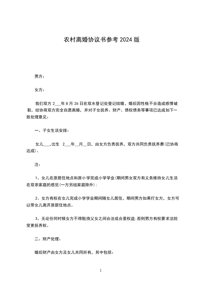 男女双方××××年9月1日结婚,××××年××月生一女孩×××,现就离婚事议达成如下协议,供双方遵照执行: