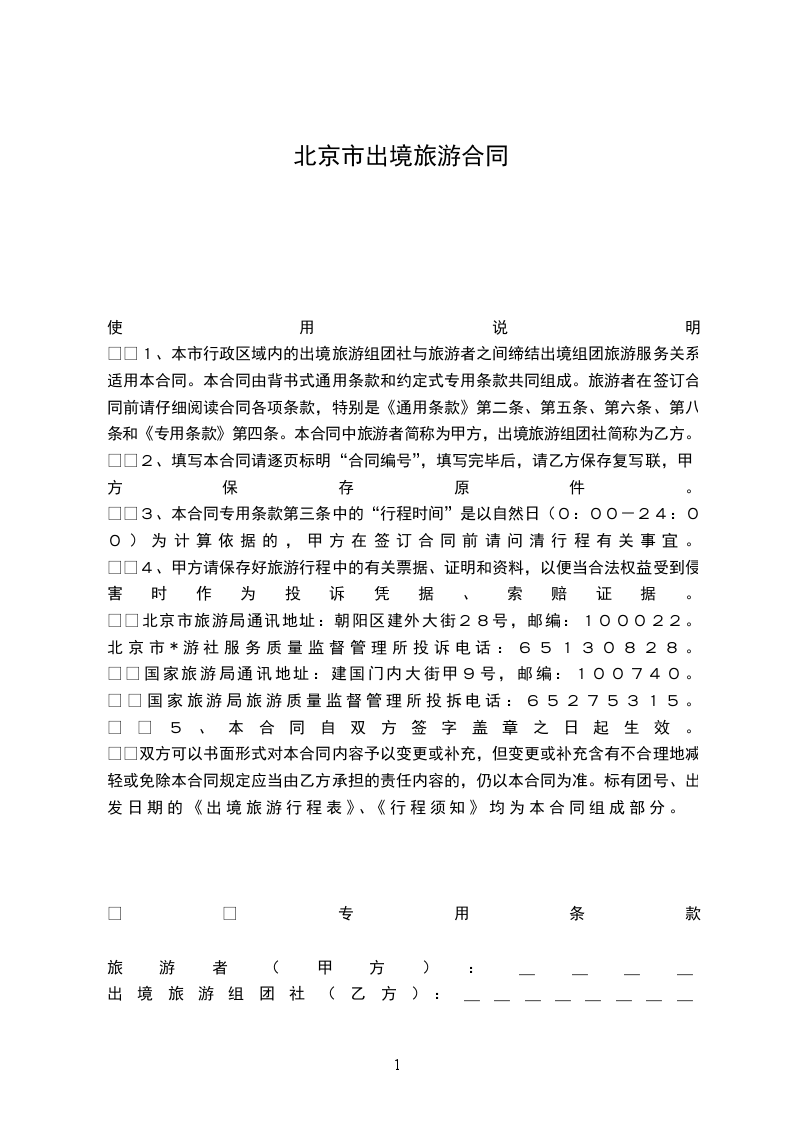 1、本市行政区域内的出境旅游组团社与旅游者之间缔结出境组团旅游服务关系适用本合同。本合同由背书式通用条款和约定式专用条款共同组成。旅游者在签订合同前请仔细阅读合同各项条款,特别是《通用条款》第二条、第五条、第六条、第八条和《专用条款》第四条。本合同中旅游者简称为甲方,出境旅游组团社简称为乙方。