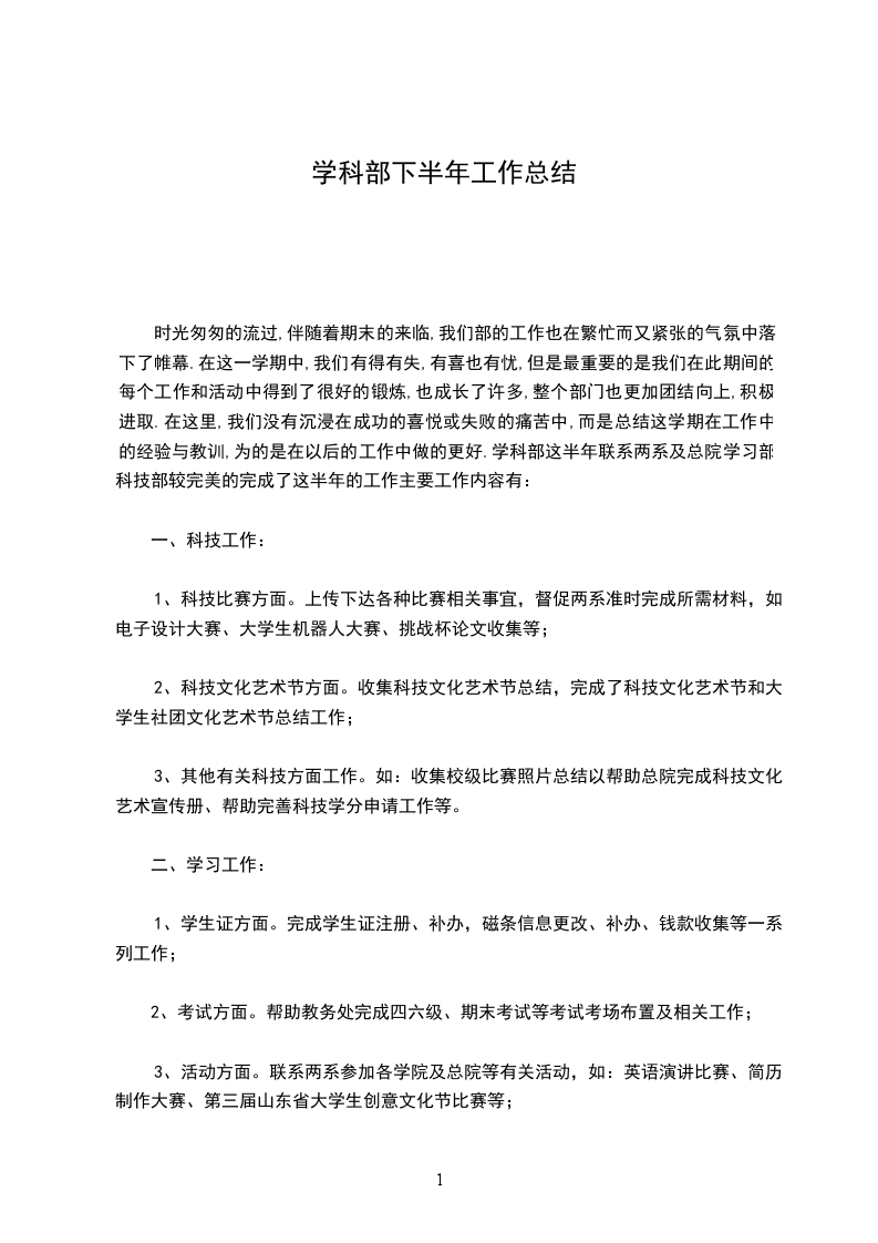 时光匆匆的流过,伴随着期末的来临,我们部的工作也在繁忙而又紧张的气氛中落下了帷幕.在这一学期中,我们有得有失,有喜也有忧,但是最重要的是我们在此期间的每个工作和活动中得到了很好的锻炼,也成长了许多,整个部门也更加团结向上,积极进取.在这里,我们没有沉浸在成功的喜悦或失败的痛苦中,而是总结这学期在工作中的经验与教训,为的是在以后的工作中做的更好.学科部这半年联系两系及总院学习部科技部较完美的完成了这半年的工作主要工作内容有: