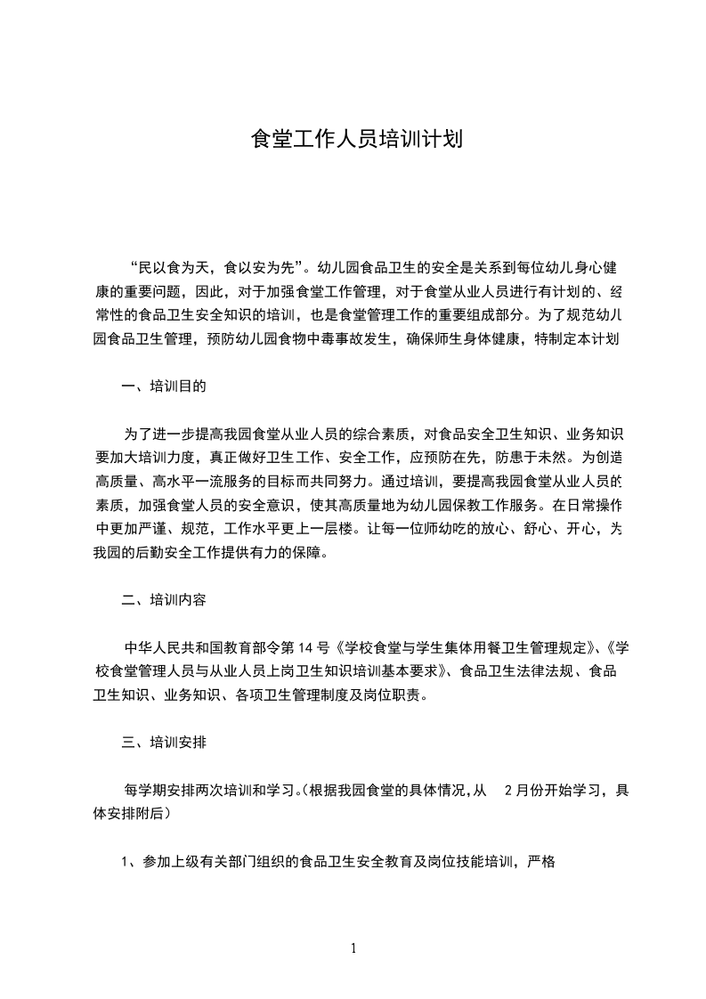“民以食为天,食以安为先”。幼儿园食品卫生的安全是关系到每位幼儿身心健康的重要问题,因此,对于加强食堂工作管理,对于食堂从业人员进行有计划的、经常性的食品卫生安全知识的培训,也是食堂管理工作的重要组成部分。为了规范幼儿园食品卫生管理,预防幼儿园食物中毒事故发生,确保师生身体健康,特制定本计划: