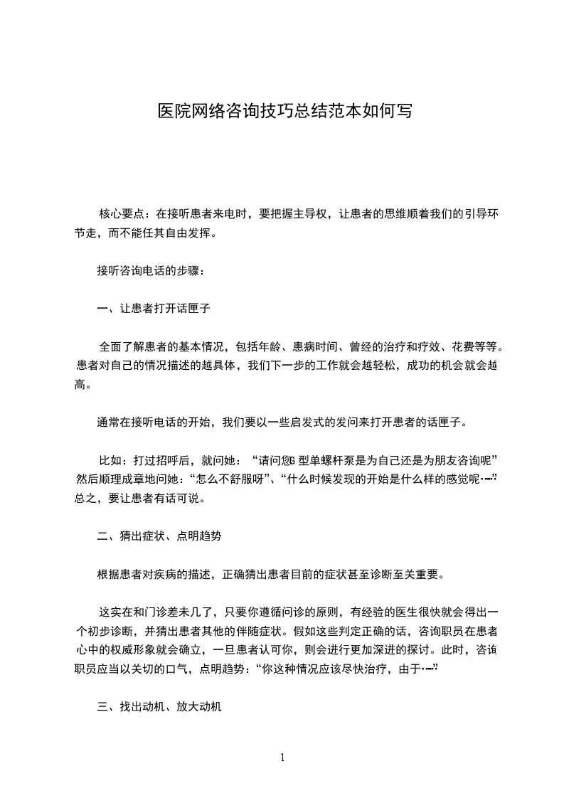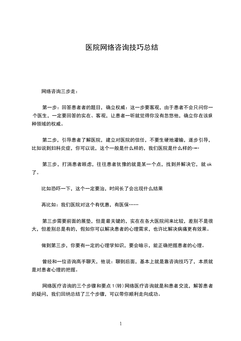网络医疗咨询的三个步骤和要点1(转)网络医疗咨询就是和患者交流,解答患者的疑问,我们回纳总结了三个步骤,可以带你顺利走向成功。