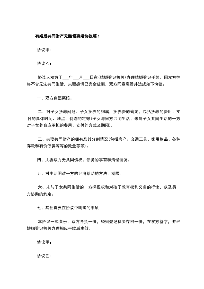 有共同财产无赔偿离婚协议书格式篇5