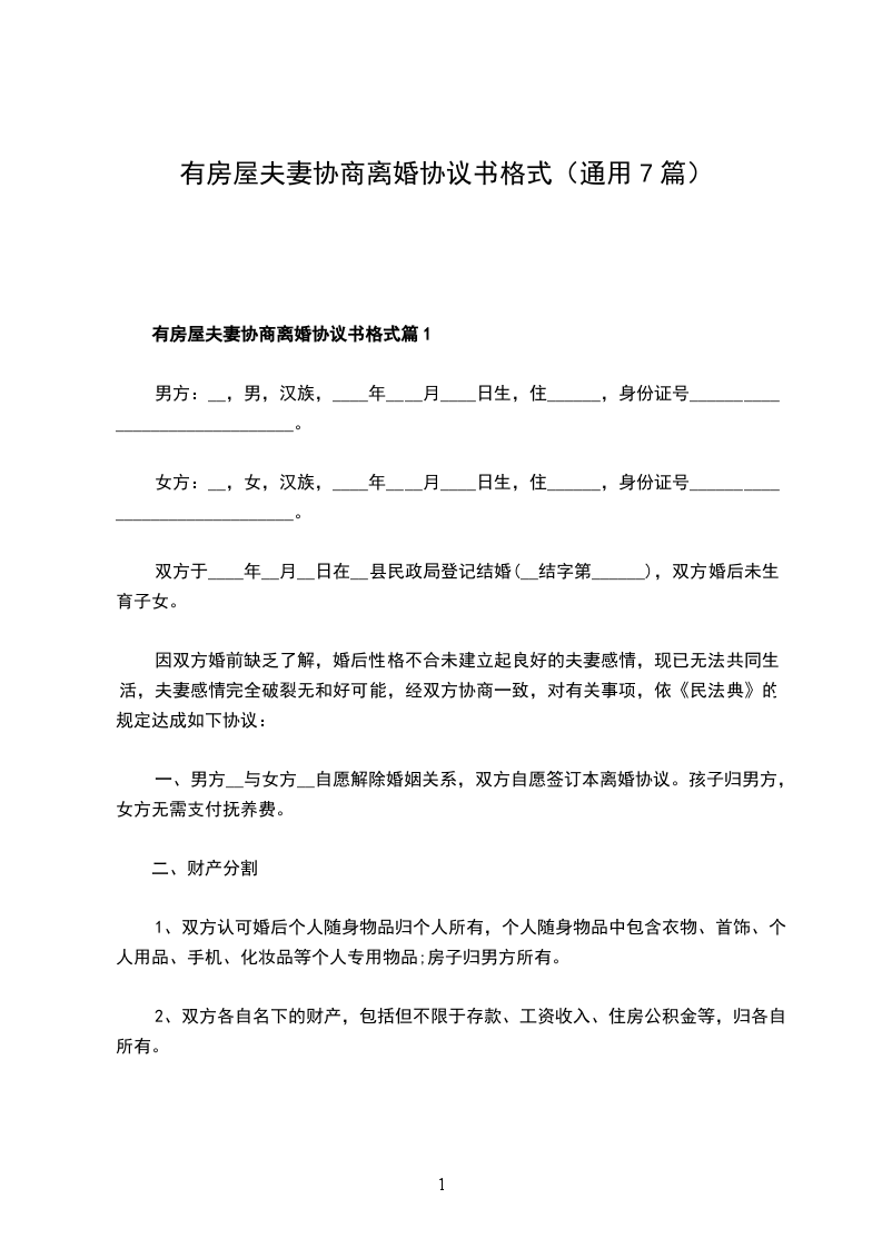 有房屋夫妻协商离婚协议书格式篇1