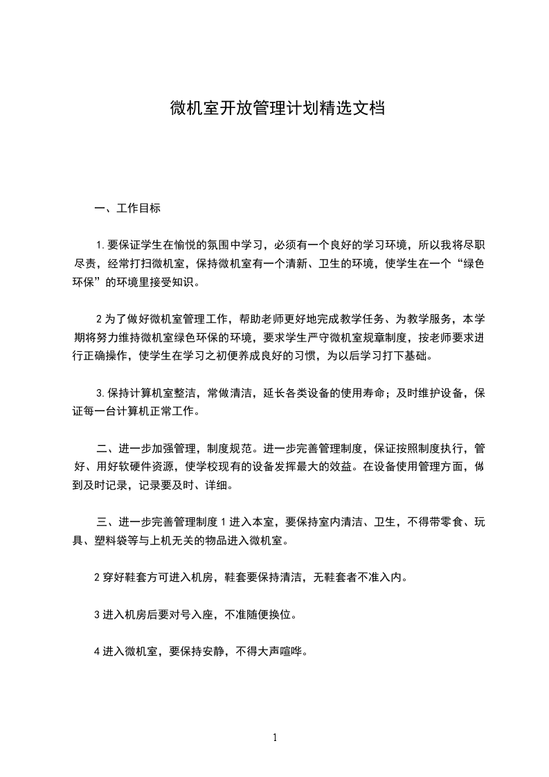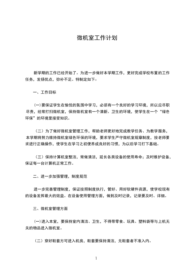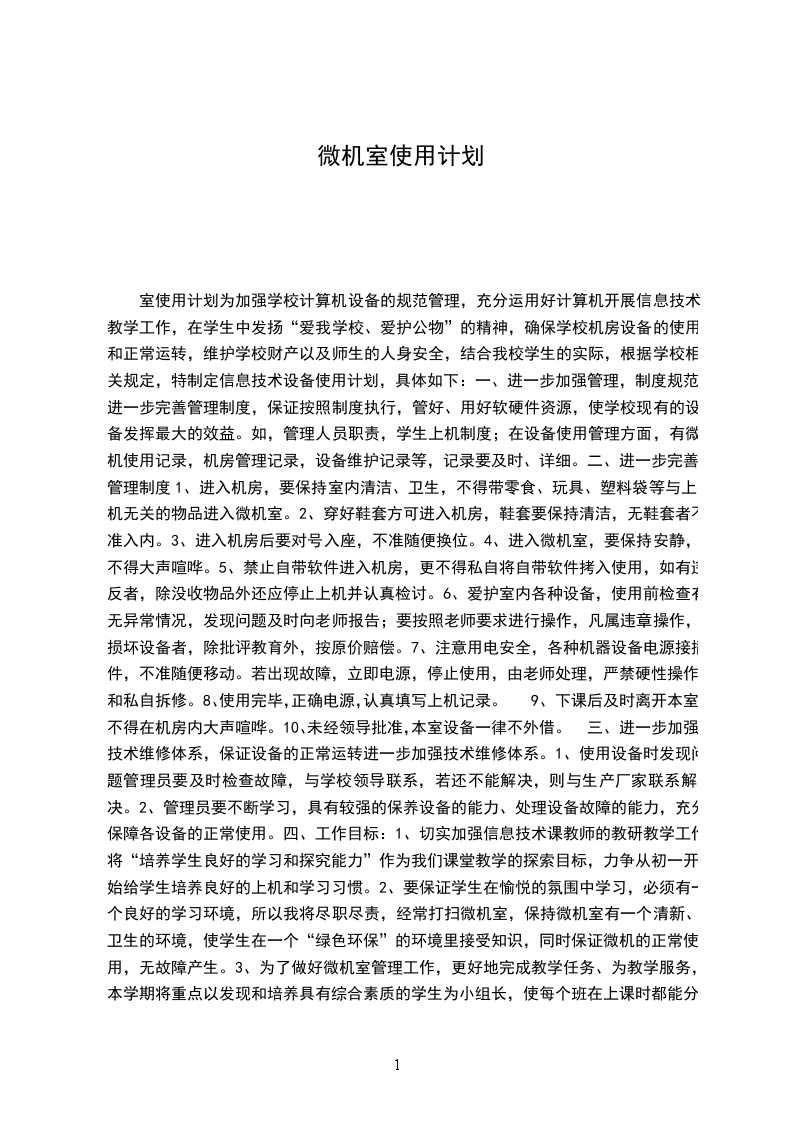 (二)为了做好微机室管理工作,帮助老师更好地完成教学任务、为教学服务,本学期将努力维持微机室绿色环保的环境,要求学生严守微机室规章制度,按老师要求进行正确操作,使学生在学习之初便养成良好的习惯,为以后学习打下基础。