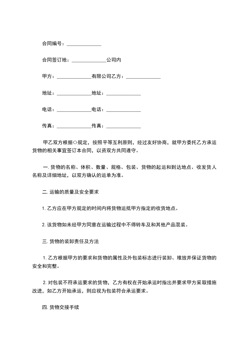 1.乙方根据甲方的要求和货物的属性及外包装标志进行装卸、堆放并保证货物的安全和完整。