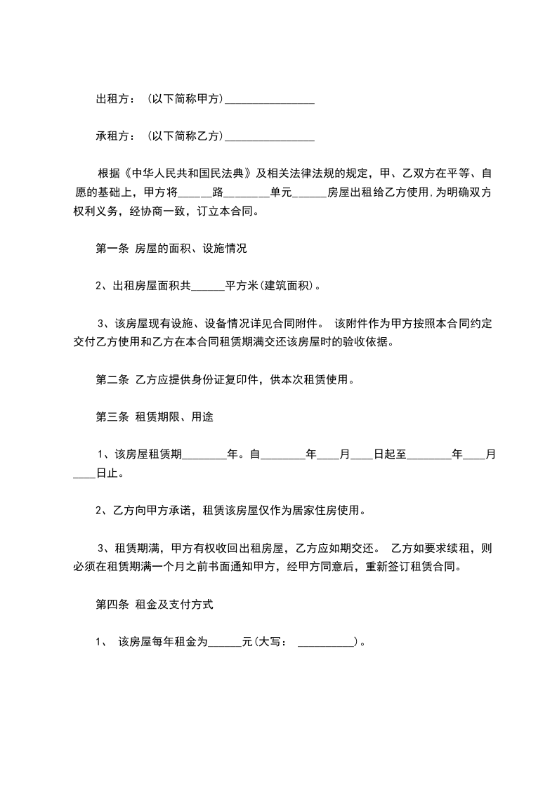 根据《中华人民共和国民法典》及相关法律法规的规定,甲、乙双方在平等、自愿的基础上,甲方将______路________单元______房屋出租给乙方使用,为明确双方权利义务,经协商一致,订立本合同。